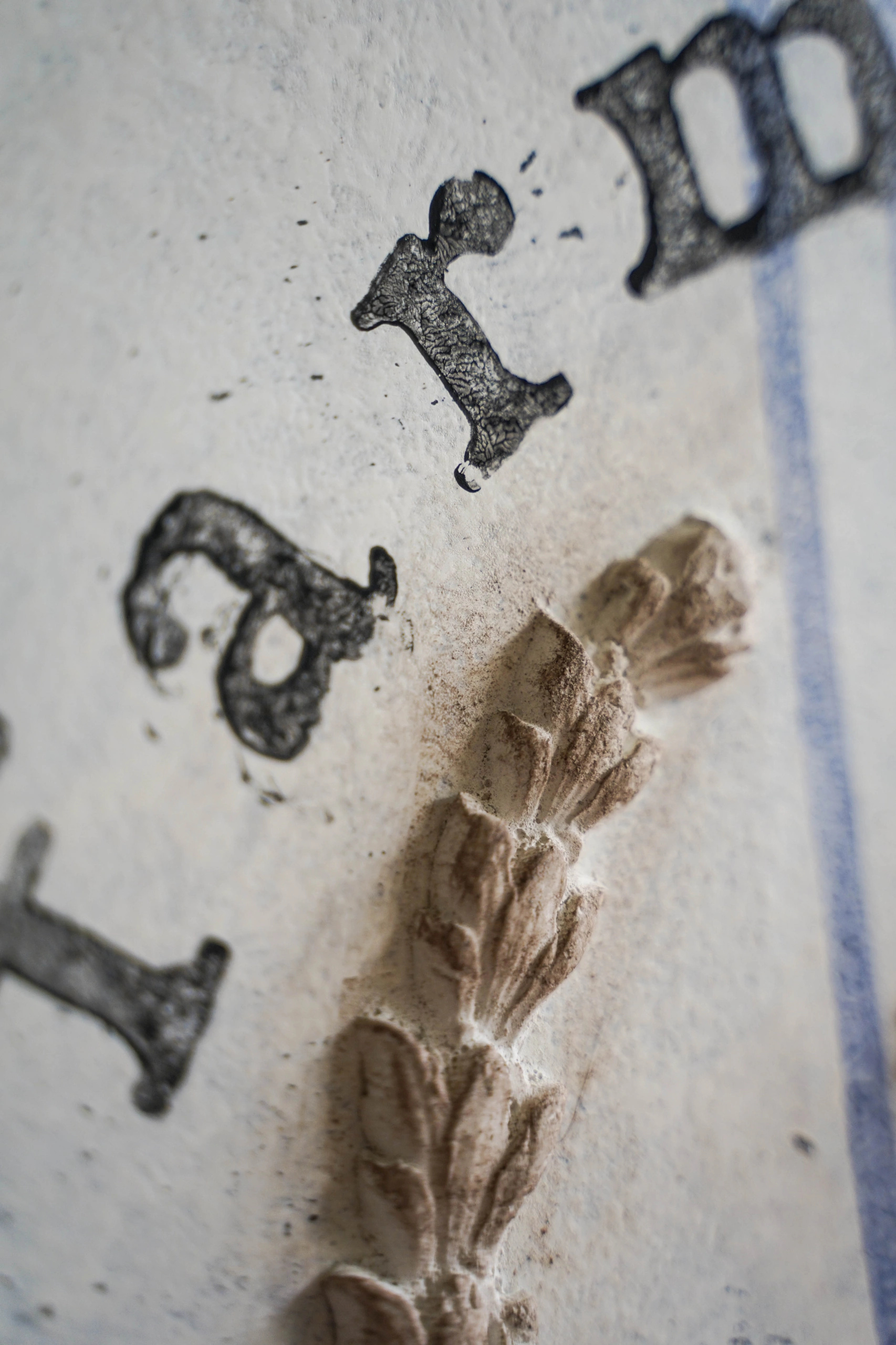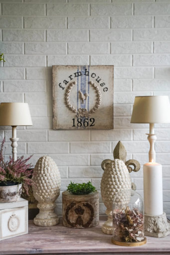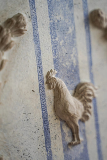 Postarzana dekoracja ścienna w kremowym kolorze. Wykonane przy użyciu ekologicznych farb kredowych, wykończone woskiem pszczelim lub woskiem carnauba. Dodatkowym elementem dekoracyjnym jest kogut.