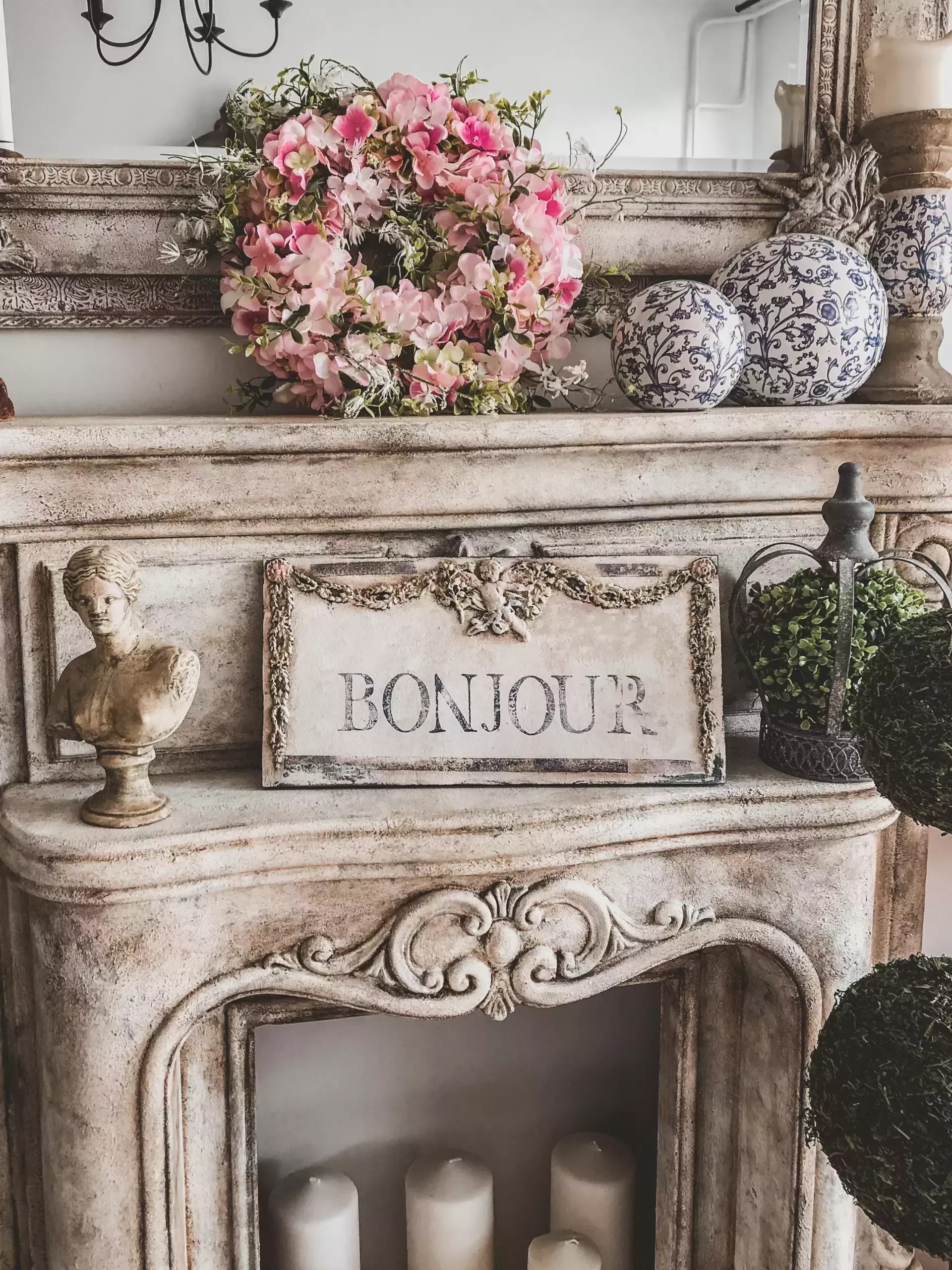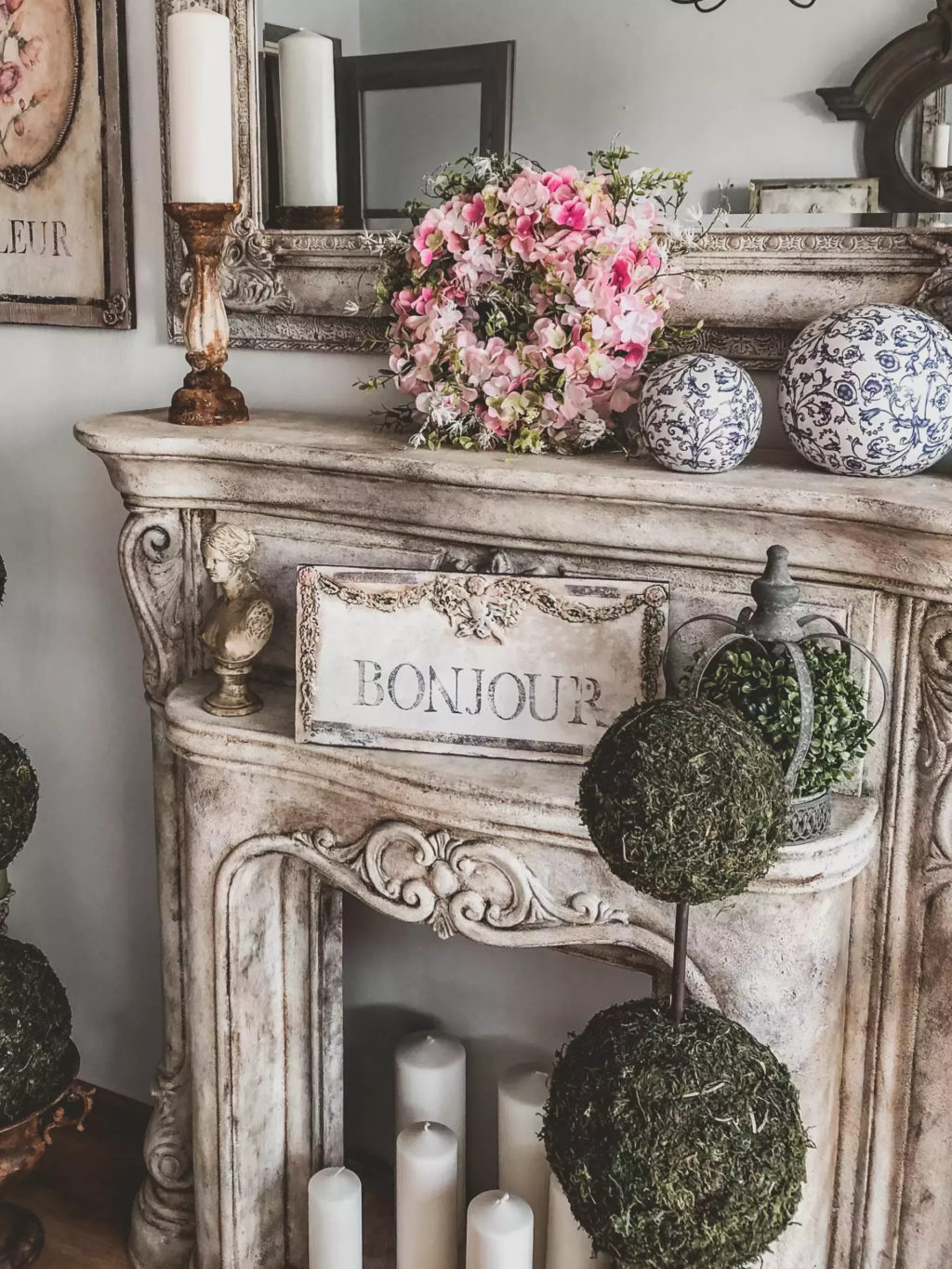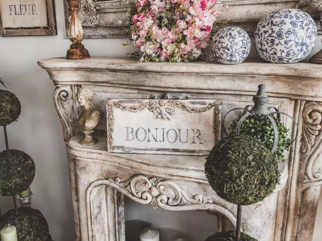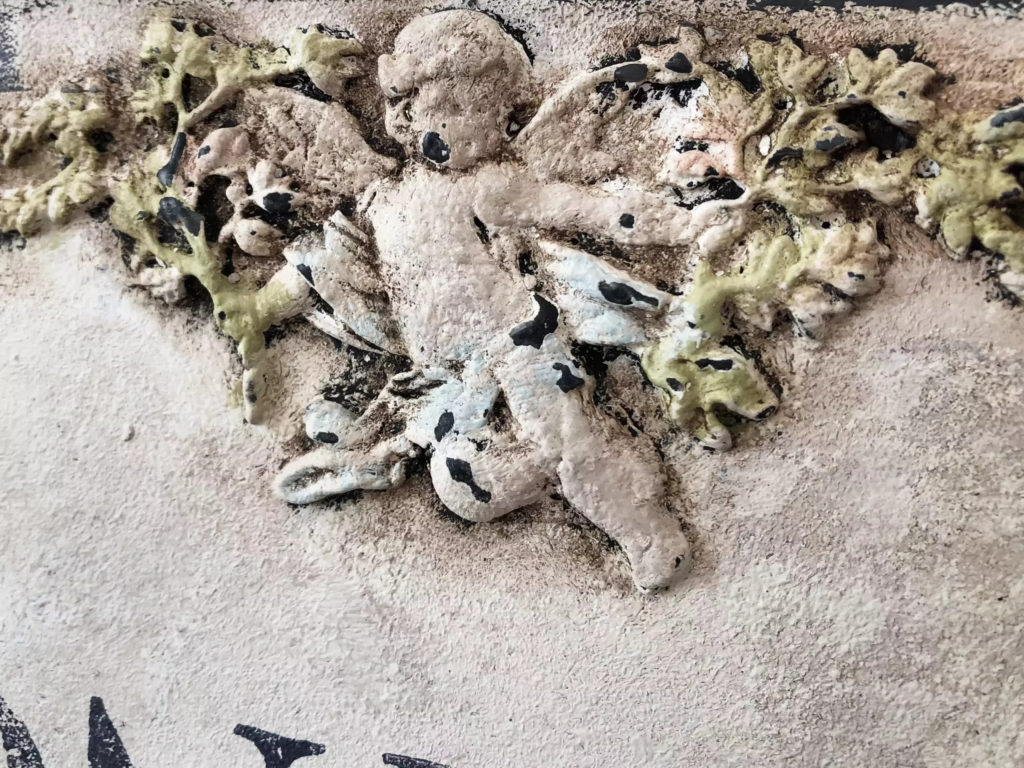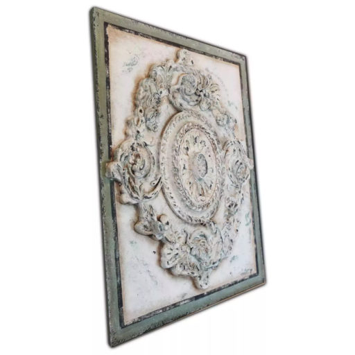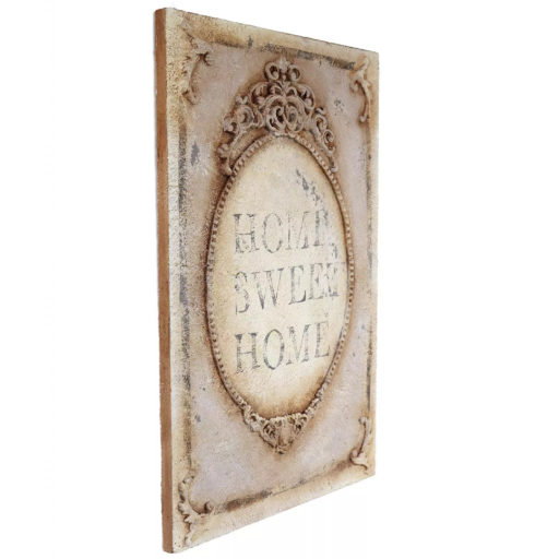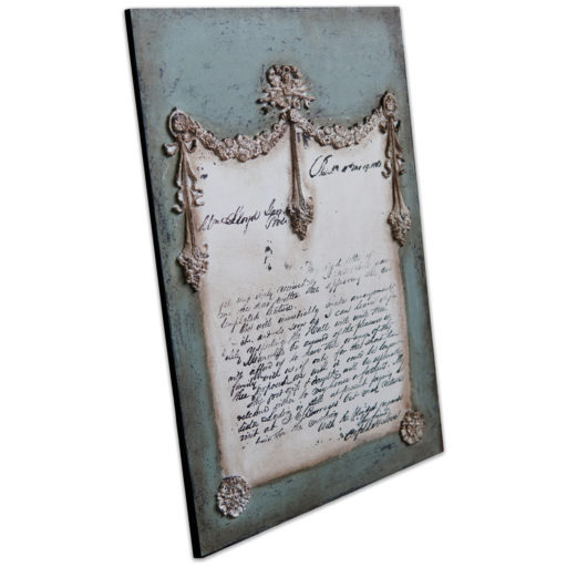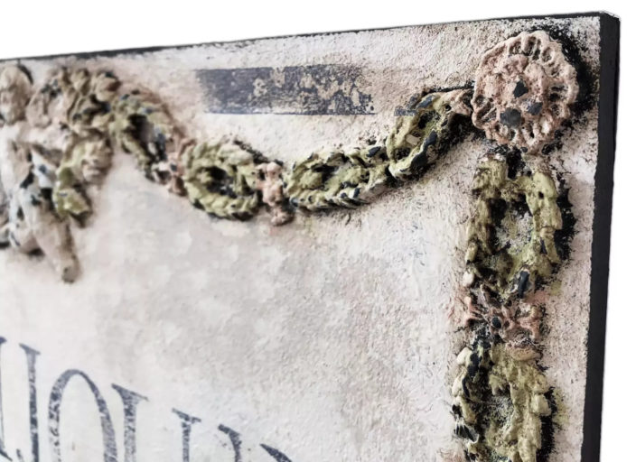 Ozdobny szyld ścienny zdobiony unikatowymi dekorami. Dekory wykonano kolorami pastelowej zieleni, błękitu oraz różu. Całość w kolorze delikatnego kremu. Efektowne patyny nadały mu charakter starego, wręcz antycznego wyglądu. Idealnie wpasuje się nie tylko we wnętrza w stylu starofrancuskim, ale będzie również pięknie się prezentował w towarzystwie nowoczesnych mebli i dekoracji. Taki szyld z pewnością pięknie udekoruje wejście do domu, wprawiając mieszkańców i gości w dobry nastrój.