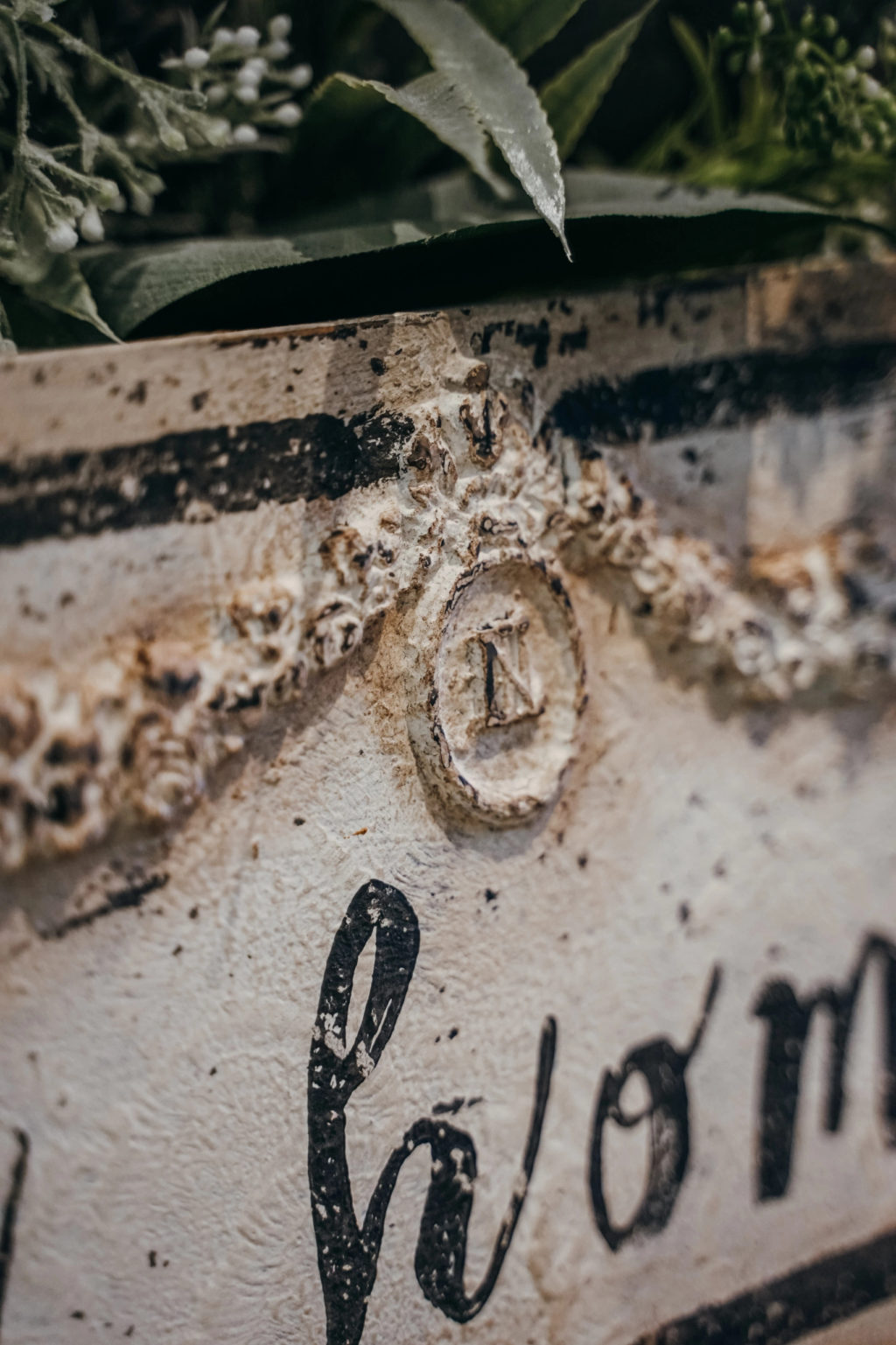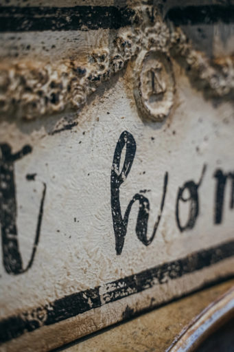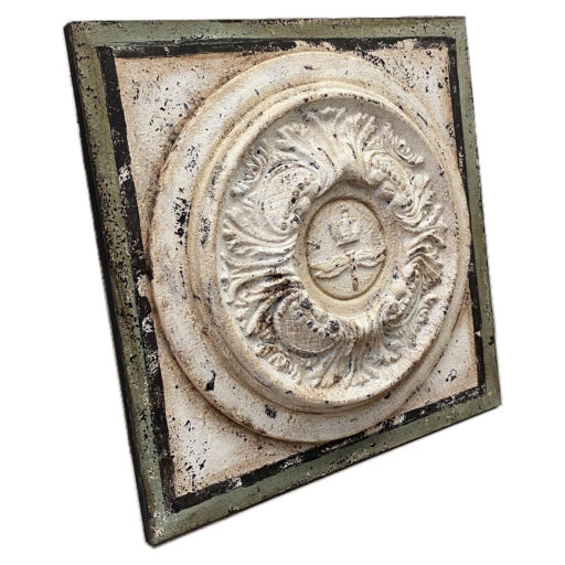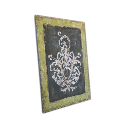 Postarzana dekoracja ścienna w oliwkowo-kremowym kolorze. Wykonane przy użyciu ekologicznych farb kredowych, wykończone woskiem pszczelim lub woskiem carnauba.