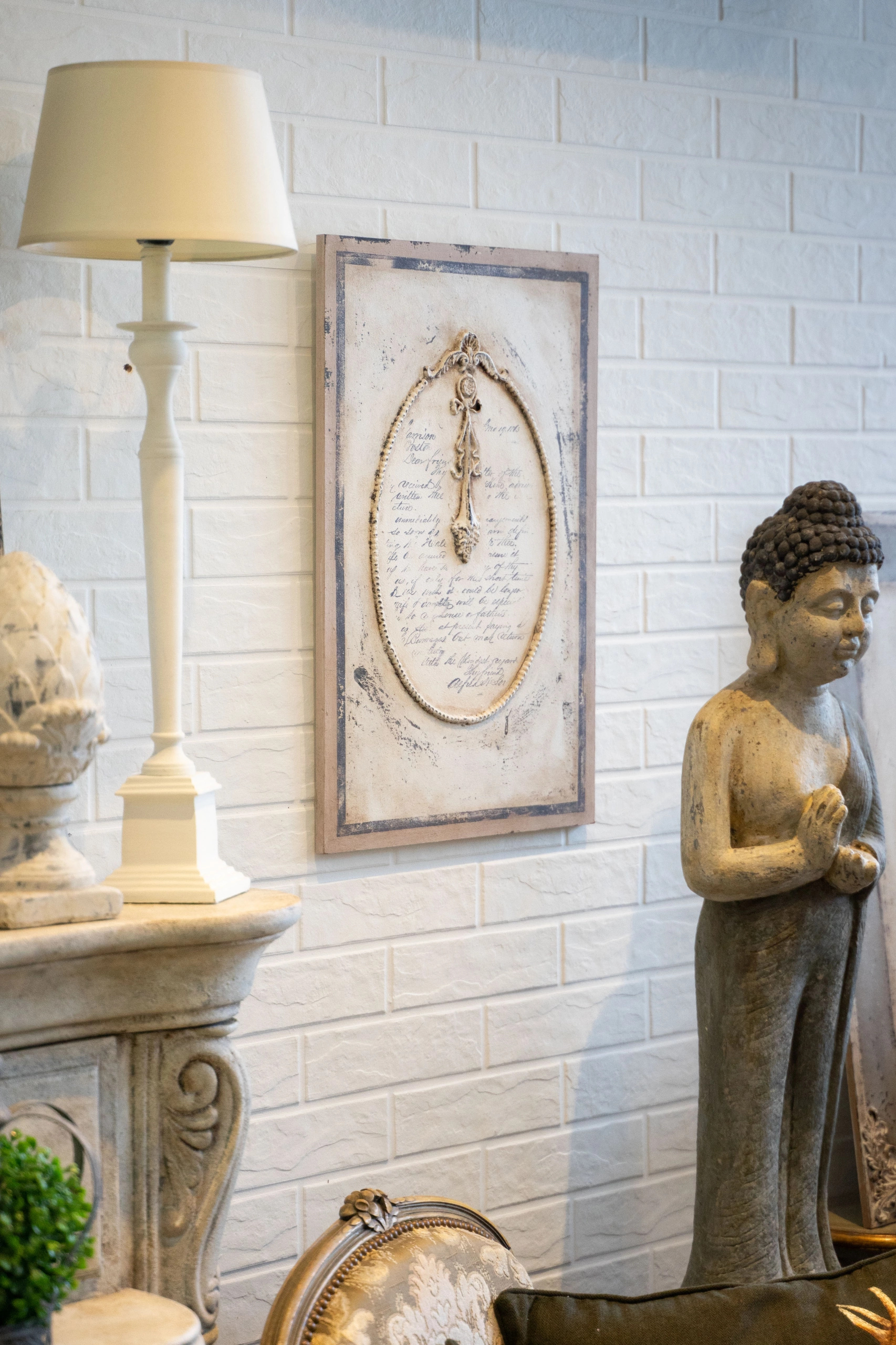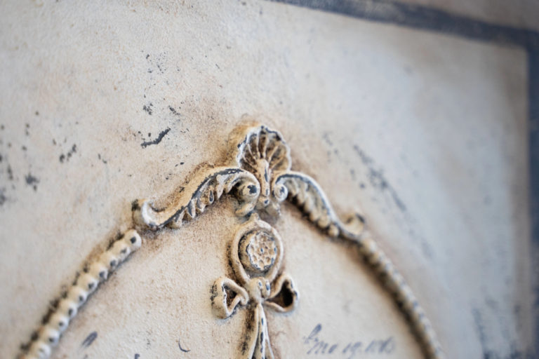 Ozdobny panel ścienny zdobiony unikatowymi dekorami. Efektowne patyny nadały mu charakter starego, wręcz antycznego looku. Swoim wyglądem, idealnie wpasuje się nie tylko we wnętrza w stylu starofrancuskim, ale będzie również pięknie się prezentował w towarzystwie nowoczesnych mebli i dekoracji.