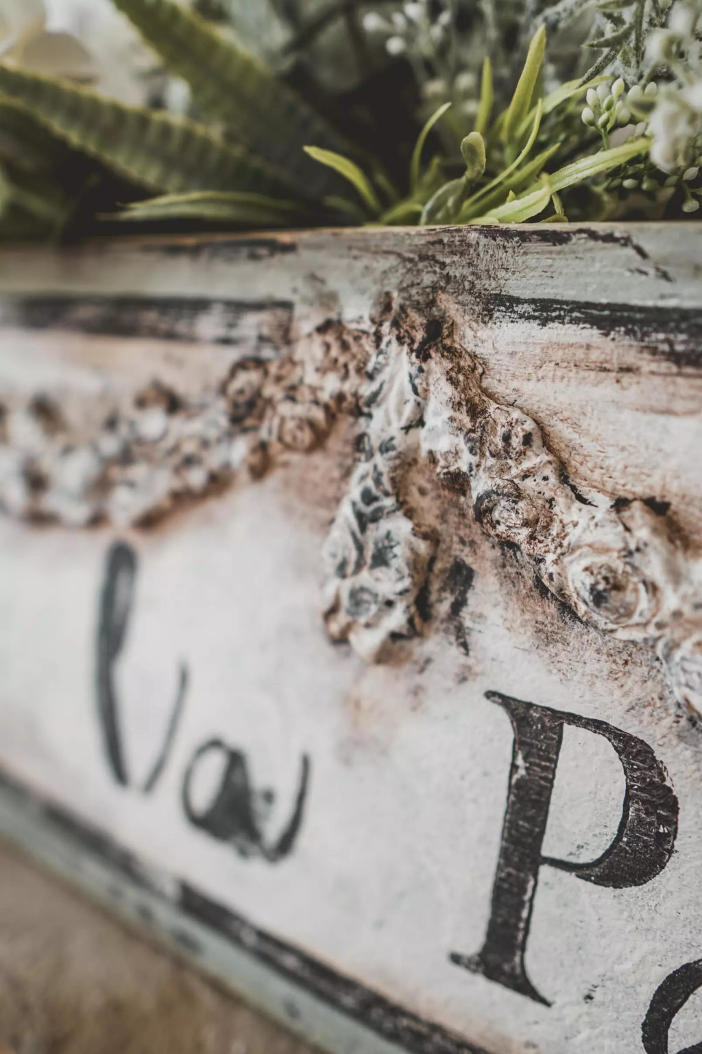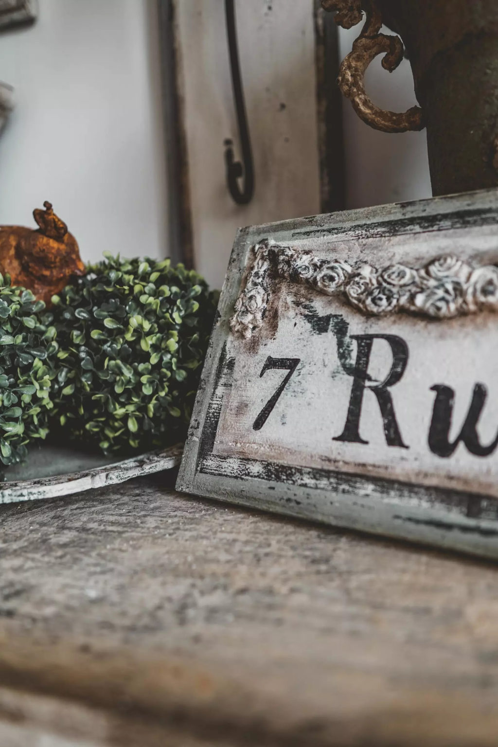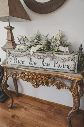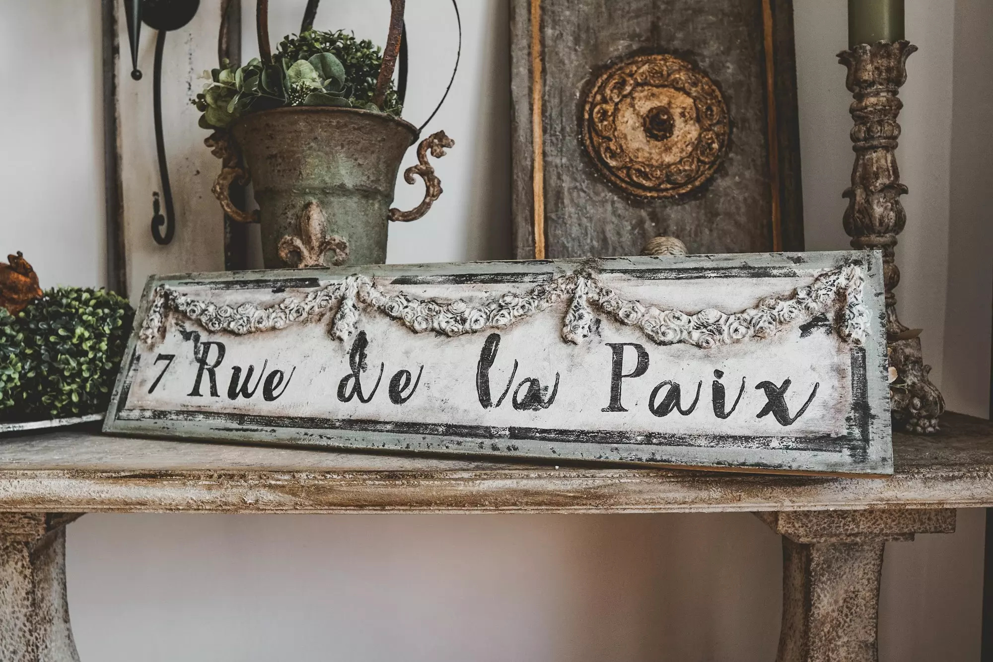 Piękny postarzany szyld w stylu starofrancuskim. Idealny dodatek zarówno do nowoczesnych jak i stylowych wnętrz.