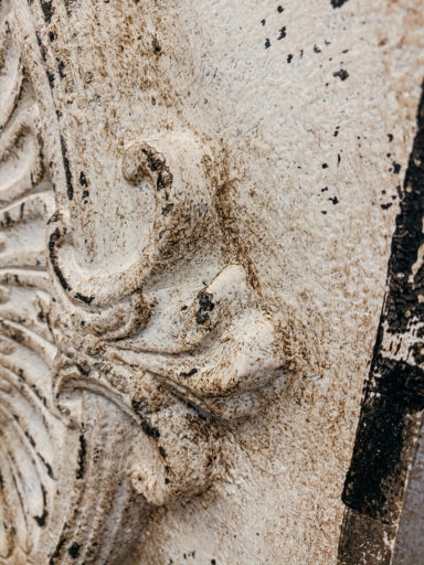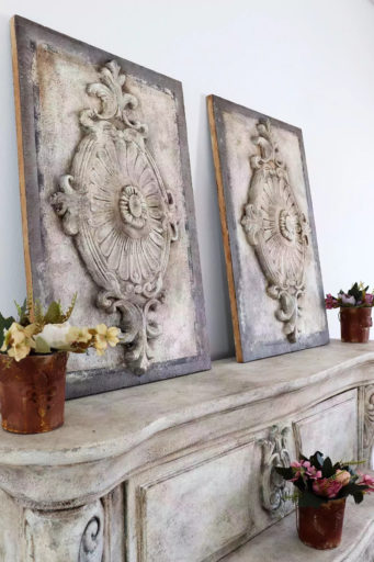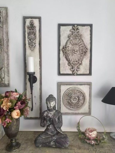 Elegancki panel ścienny w grafitowo kremowym kolorze. Wykonany na płycie drewnopodobnej przy użyciu ekologicznych farb kazeinowych, wykończone woskiem pszczelim lub woskiem carnauba. Dodatkowym elementem dekoracyjnym jest pięknie rzeźbiony dekor.