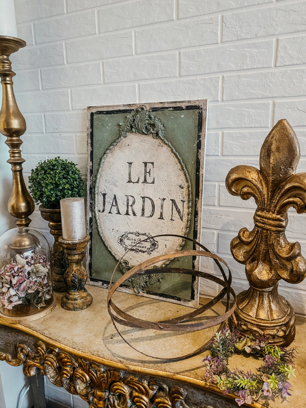 Ozdobny panel ścienny zdobiony unikatowymi dekorami. Efektowne patyny nadały mu charakter starego, wręcz antycznego wyglądu. Wewnątrz umieściliśmy napis “LE JARDIN”. Dekoracja swoim wyglądem, idealnie wpasuje się nie tylko we wnętrza w stylu starofrancuskim, ale będzie również pięknie się prezentowała w towarzystwie nowoczesnych mebli i dekoracji.
