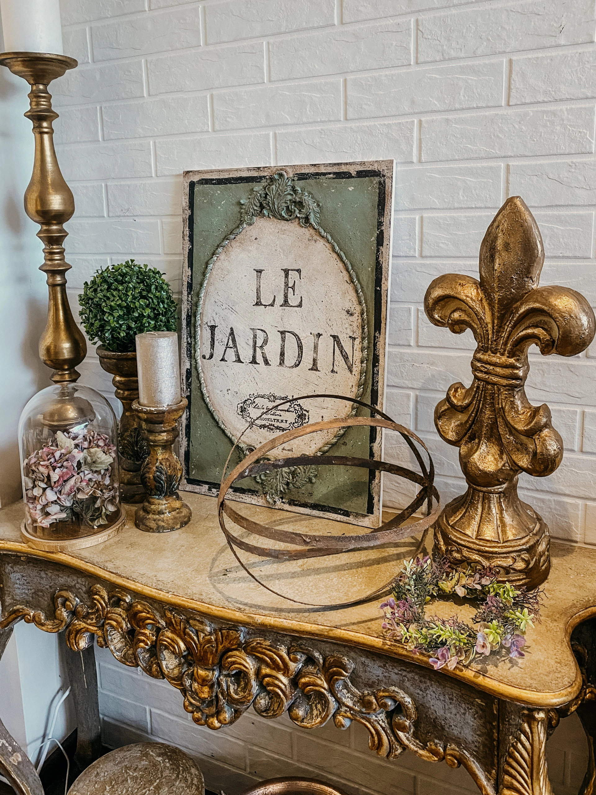 Ozdobny panel ścienny zdobiony unikatowymi dekorami. Efektowne patyny nadały mu charakter starego, wręcz antycznego wyglądu. Wewnątrz umieściliśmy napis “LE JARDIN”. Dekoracja swoim wyglądem, idealnie wpasuje się nie tylko we wnętrza w stylu starofrancuskim, ale będzie również pięknie się prezentowała w towarzystwie nowoczesnych mebli i dekoracji.
