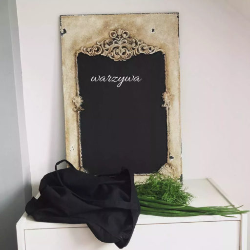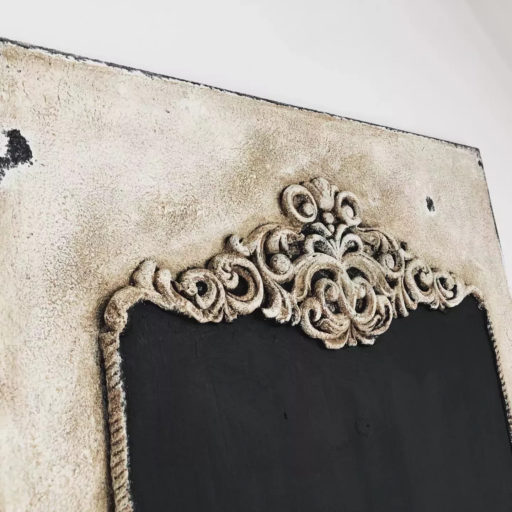 Czarna tablica na zapiski w pięknej ręcznie zdobionej ramie w stylu shabby chic. Dekoracja swoim wyglądem, idealnie wpasuje się nie tylko we wnętrza w stylu starofrancuskim, ale będzie również pięknie się prezentowała w towarzystwie nowoczesnych mebli i dekoracji.